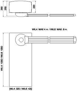 корпус сделан целиком из нержавеющей стали и окрашен интенсивное использование низковольтное питание ~ 230 В: мотор 24 В встроенный блок управления, его можно отцепить для облегчения ремонта и прокладки электрических проводов простая установка: стрела шлагбаума устанавливается как в правую, так и в левую сторону легко восстанавливает равновесие: линейное регулирование пружины работает во время отключения питания, благодаря находящимся внутри аккумуляторам концевой выключатель во время открывания и закрывания с электрическим и механическим регулированием скорость регулируется электронным способом: минимальная скорость открывания модели WIL4 - 3,5 секунды, модели WIL6 - 5 секунд регулятор безопасности механизма во время открывания и закрывания стрела шлагбаума сделана из алюминия и окрашена: на нем легко устанавливаются сигнальные огни при помощи присосок сигнальные лампы LED: высокоэффективные и долговечные шлагбаум защищен простым замком закрепляющая база с фиксаторами